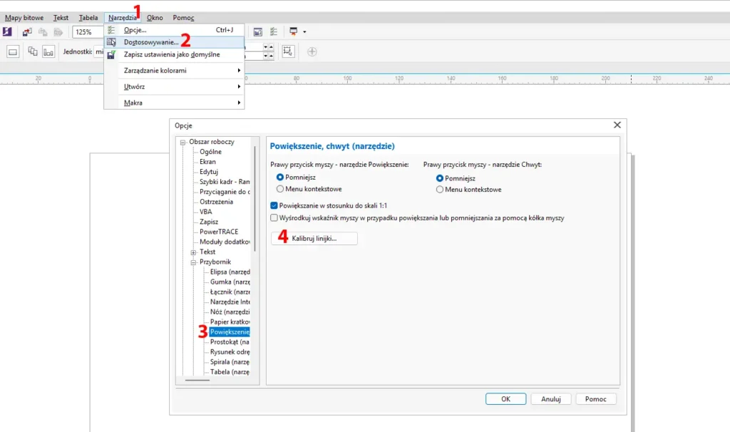 W sekcji „Powiększenie, chwyt (narzędzie)” wybierz Kalibruj linijki… (4).